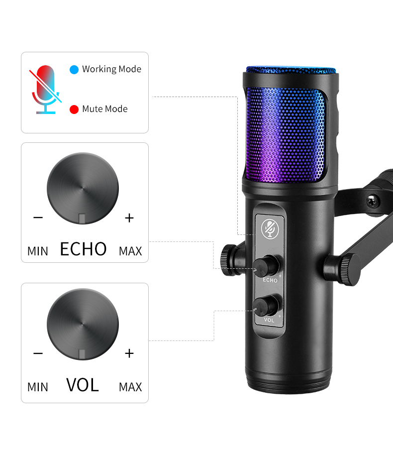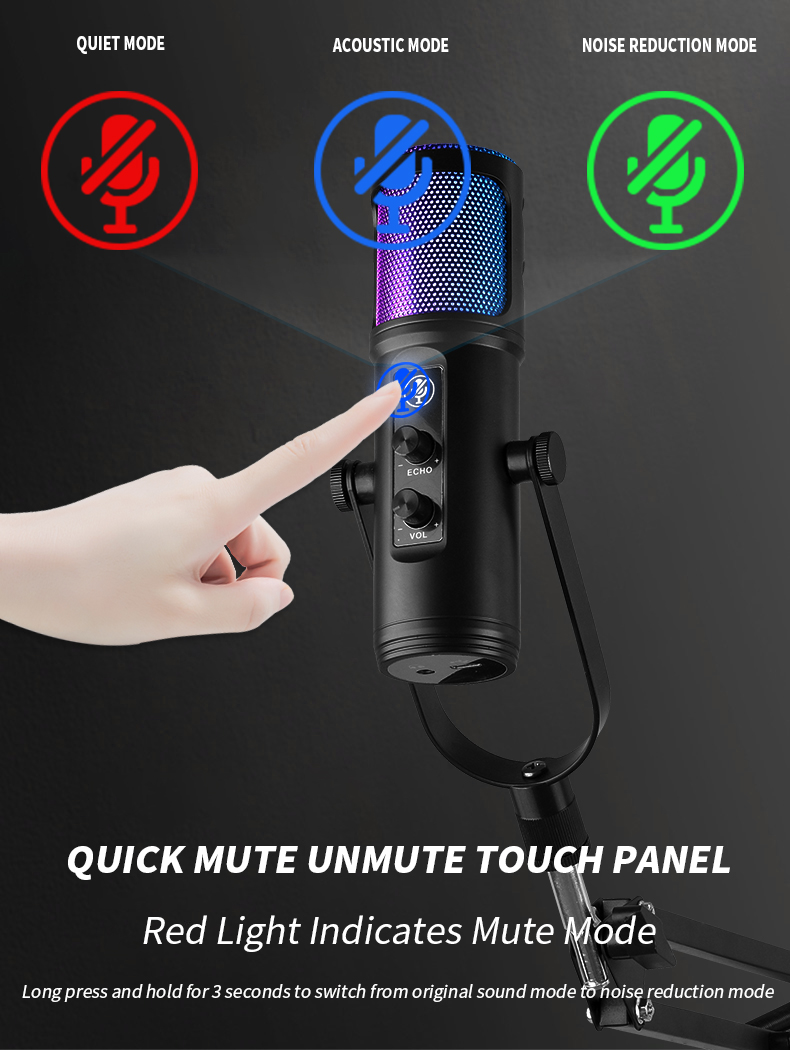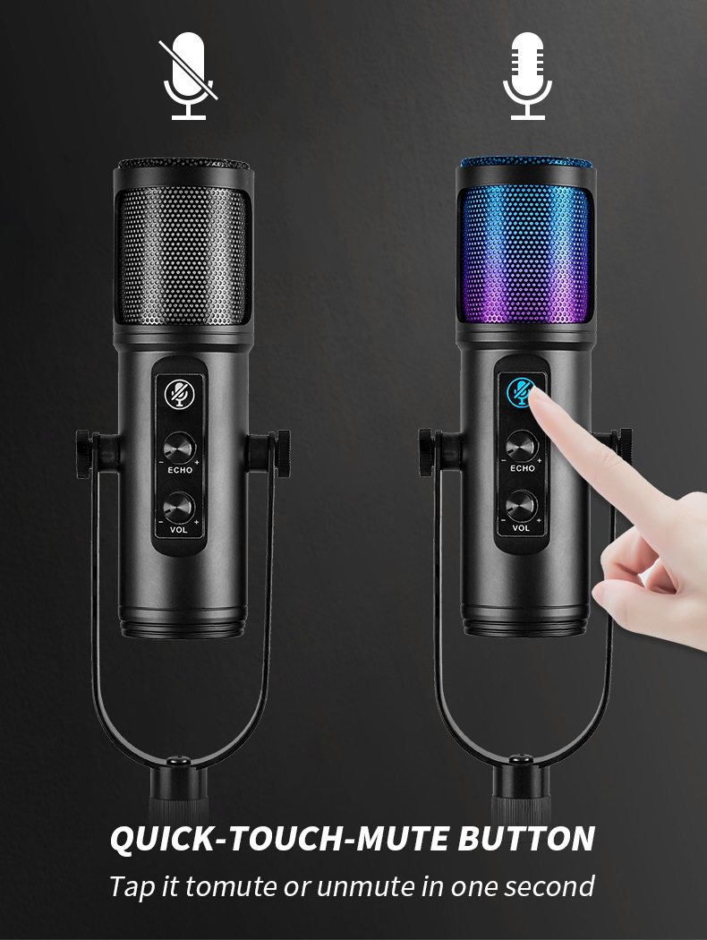 [Dynamic multicolor gradient] Use the dynamic RGB lighting function in the microphone to amplify your game and real-time streaming media immersion, seamlessly transform, and create a charming pulsating atmosphere. This RGB microphone for podcasting shows off seven rainbow-style colors, seamlessly transitioning through the automatic gradient color mode when the microphone is active. Mute (short press) to get an elegant red glow; long press the mute button to turn off the light.