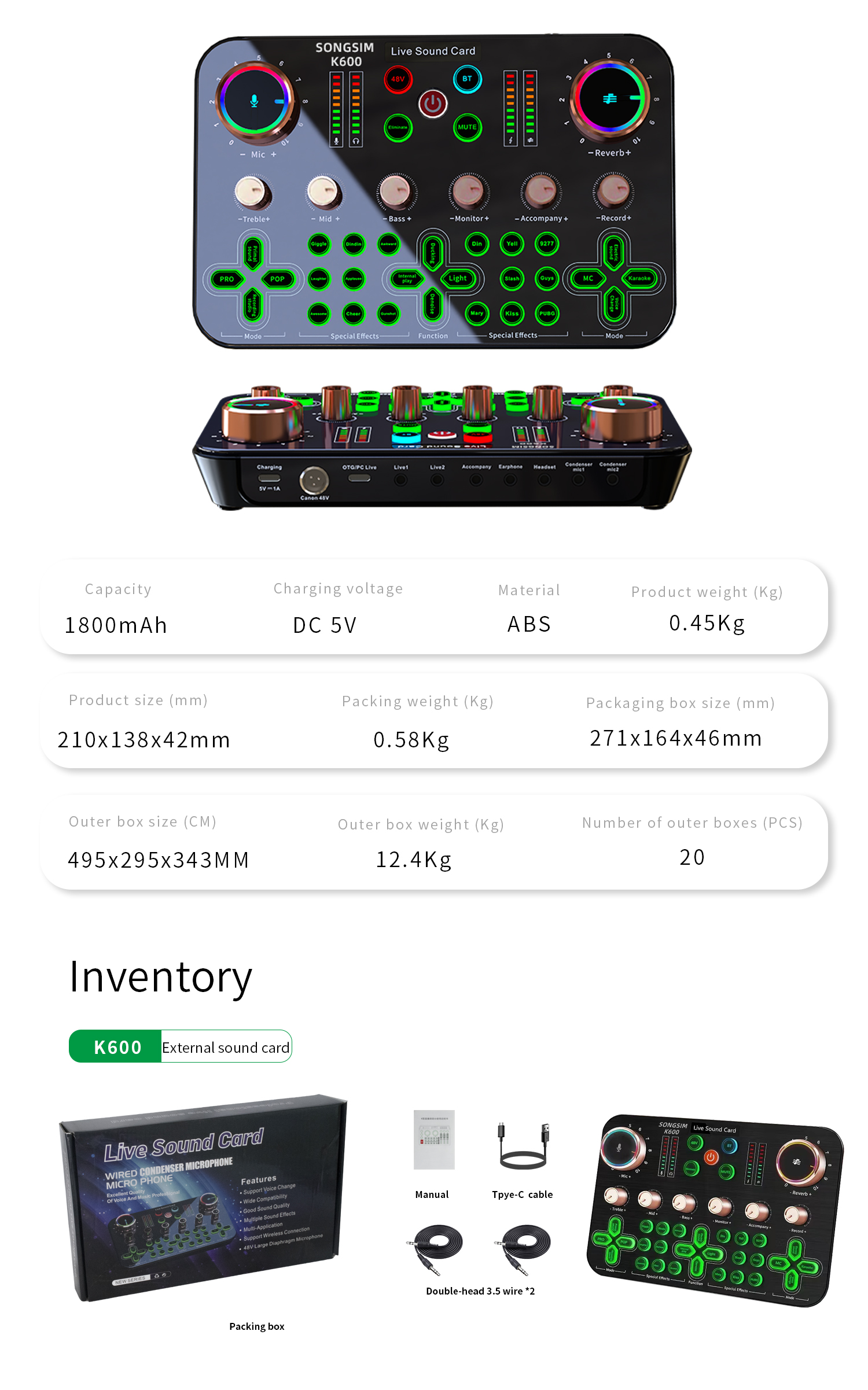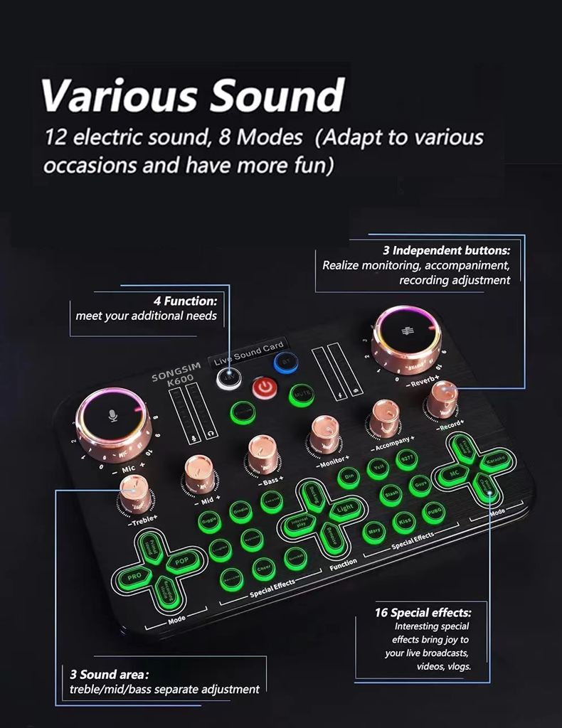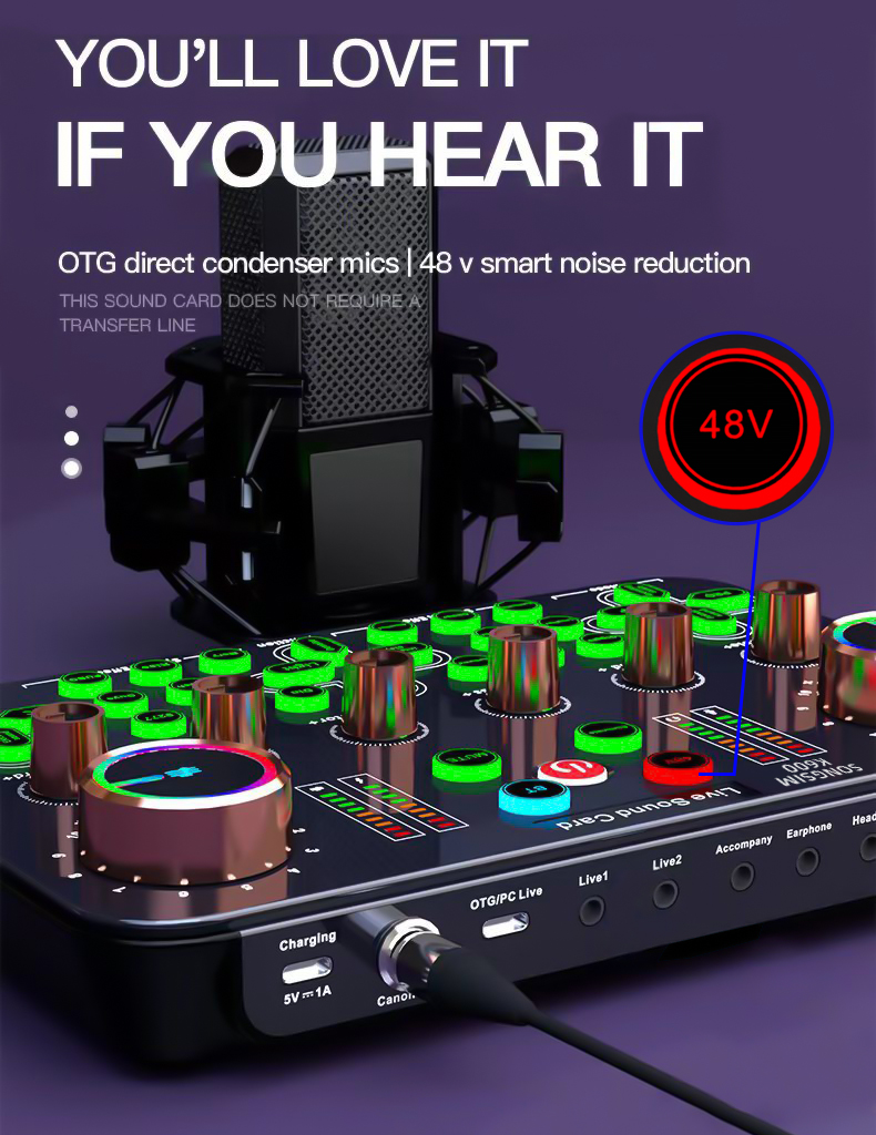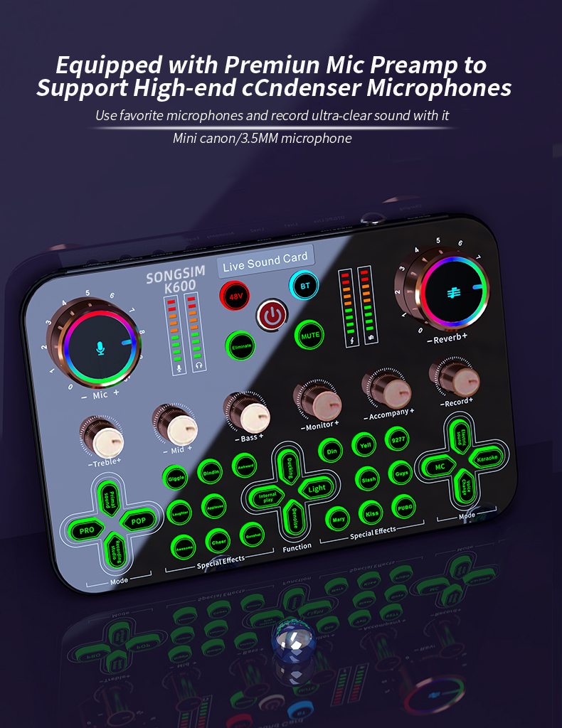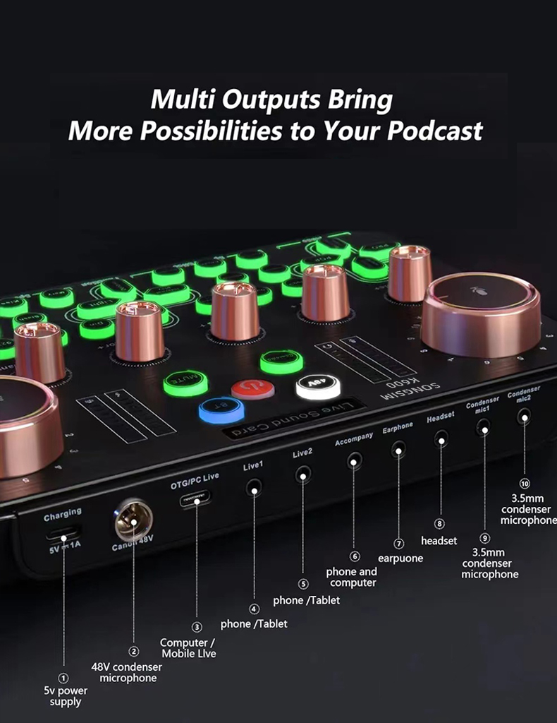 - 【XLR Mic Input】-- Facmogu K600 Live Sound Card features XLR audio interface, which is great to up your audio quality with your XLR setup. And support 48V microphone phantom power input, which can drive the XLR microphones to enhance his performance and give you unrivaled sound quality and open up more choices for mics, taking your podcasting and streaming audio to new heights!