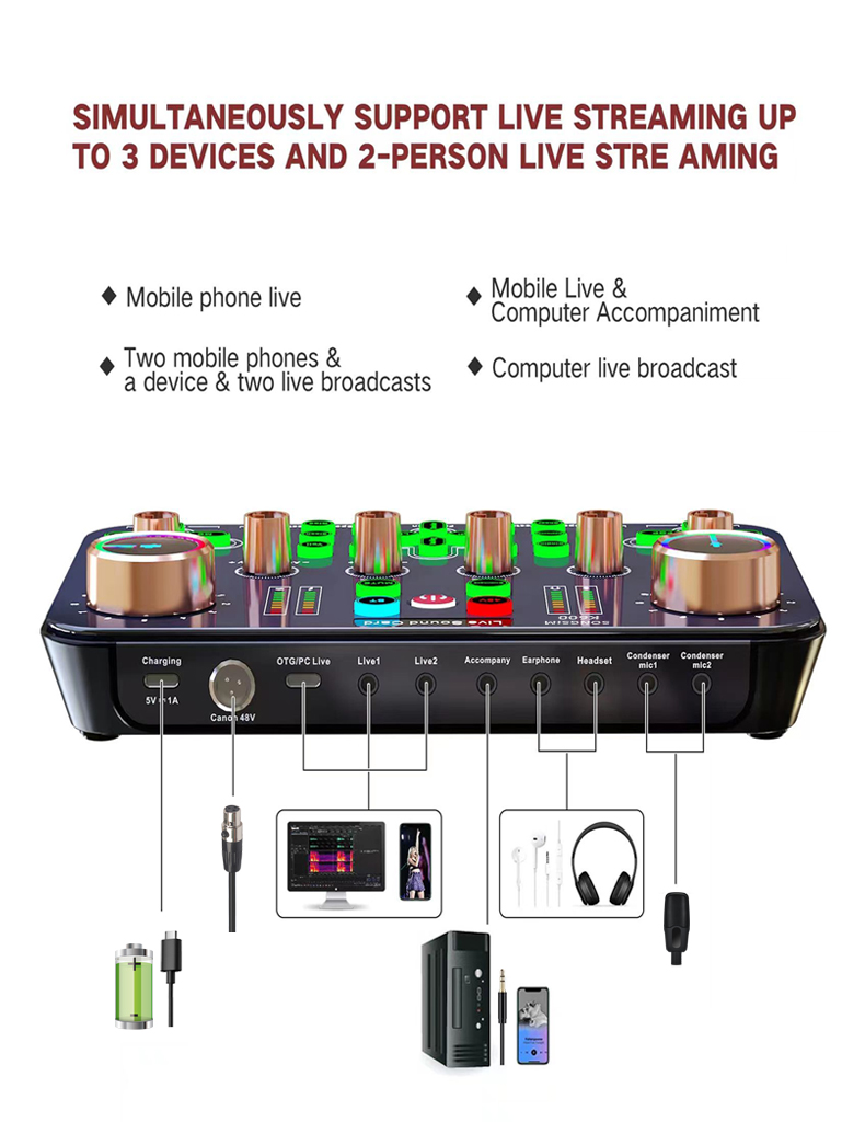 - 【Great Compatibility】-- This streaming audio mixer works well on PC, smartphones, tablets, Windows, etc., plug and play, no drivers required. Audio mixer for PC, which supports connecting two mobile phones and dual microphones to live stream on both streaming platforms simultaneously. It also supports USB digital connection and analogue transmission, BT input. But if your mobile phone does not have a 3.5mm jack, you need to use an OTG adapter.