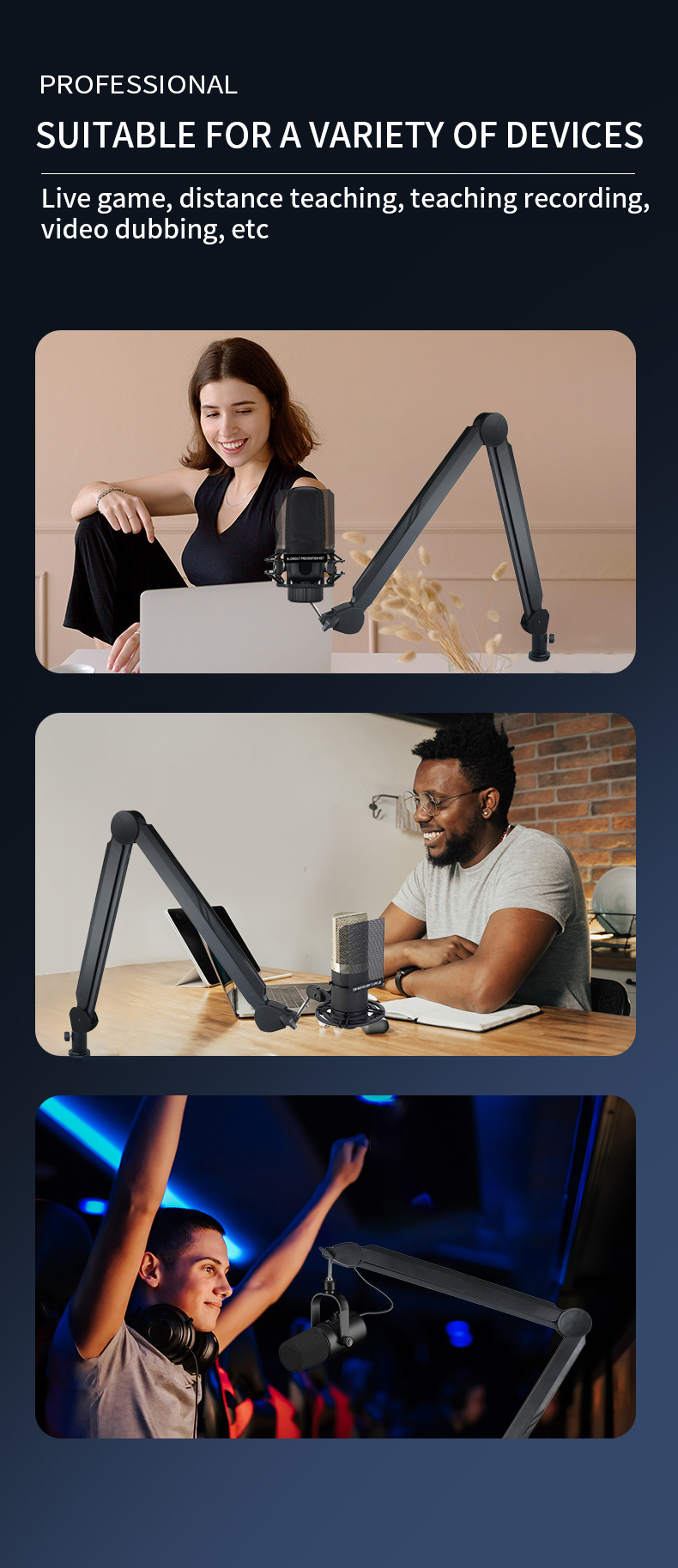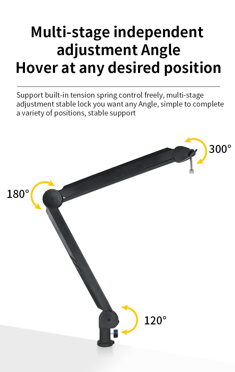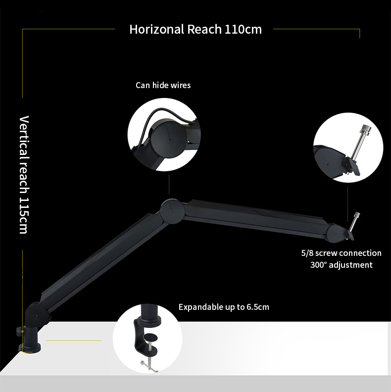 Cable Management Channels: The upgraded mic arms are optimized with built-in channels as cable management for you to put your cables in by simply removing the rubber cable covers, bringing a clean and neat look without getting your setups and cables tangled while recording or live streaming. The thoughtful design frees the whole look of being a mess and provides a shelter for cables. Adjustable Angle & Smooth Movement: The boom arm is fully adjustable in 135° back and forth, and 180° up and down, easy to adjust in multiple directions silently. The base is 360° rotatable. This flexible arm stand allows you to determine which angle is the best for your recording needs. Upgraded Length & Height: The length of the arm is increased to 14 inches and the package comes with a 6.3 inches extension riser for extra height. This mic stand has a max reach of 32.3 inches horizontally and 37.4 inches vertically to extend over most monitors. The desk clamp can clip to any desk up to 2 inches thick. Built-in Springs & Strong Stability: Made of high-grade thickened steel, this sturdy microphone stand features strong internal springs for reaching a max load-bearing capacity of 3.5 pounds. It can easily handle the weight of heavy microphones like Yeti and SM7B, staying where you put it. Universal Compatibility: The 5/8" metal connector is compatible with different kinds of microphones like Blue Yeti, Hyper X QuadCast, SoloCast, Blue Snowball, Shure SM7B, Shure MV7, AT2020, AT2020USB+, AT2035, ATR2500-USB, ATR2100-USB, Fifine K669B (Shock mount not included), Fifine AM8, etc. Perfect for studio, recording, podcasting, streaming, stage.