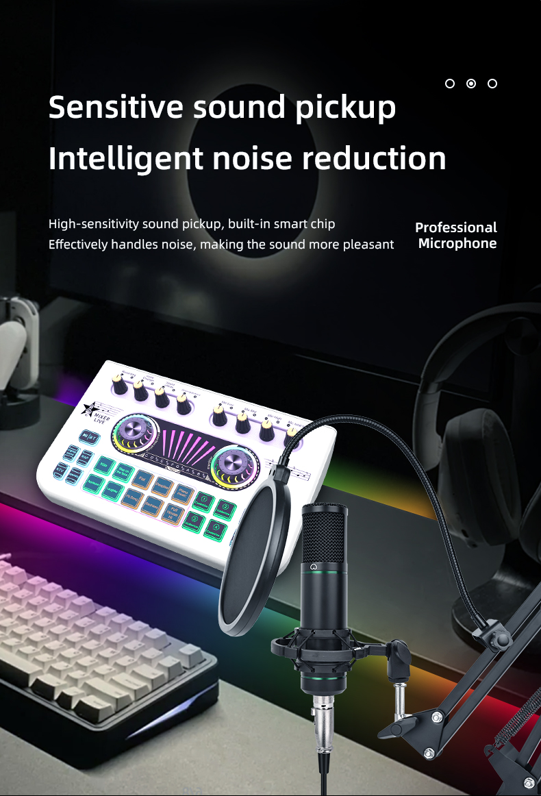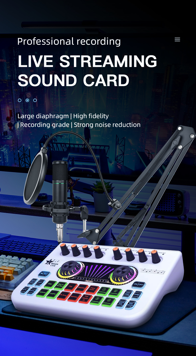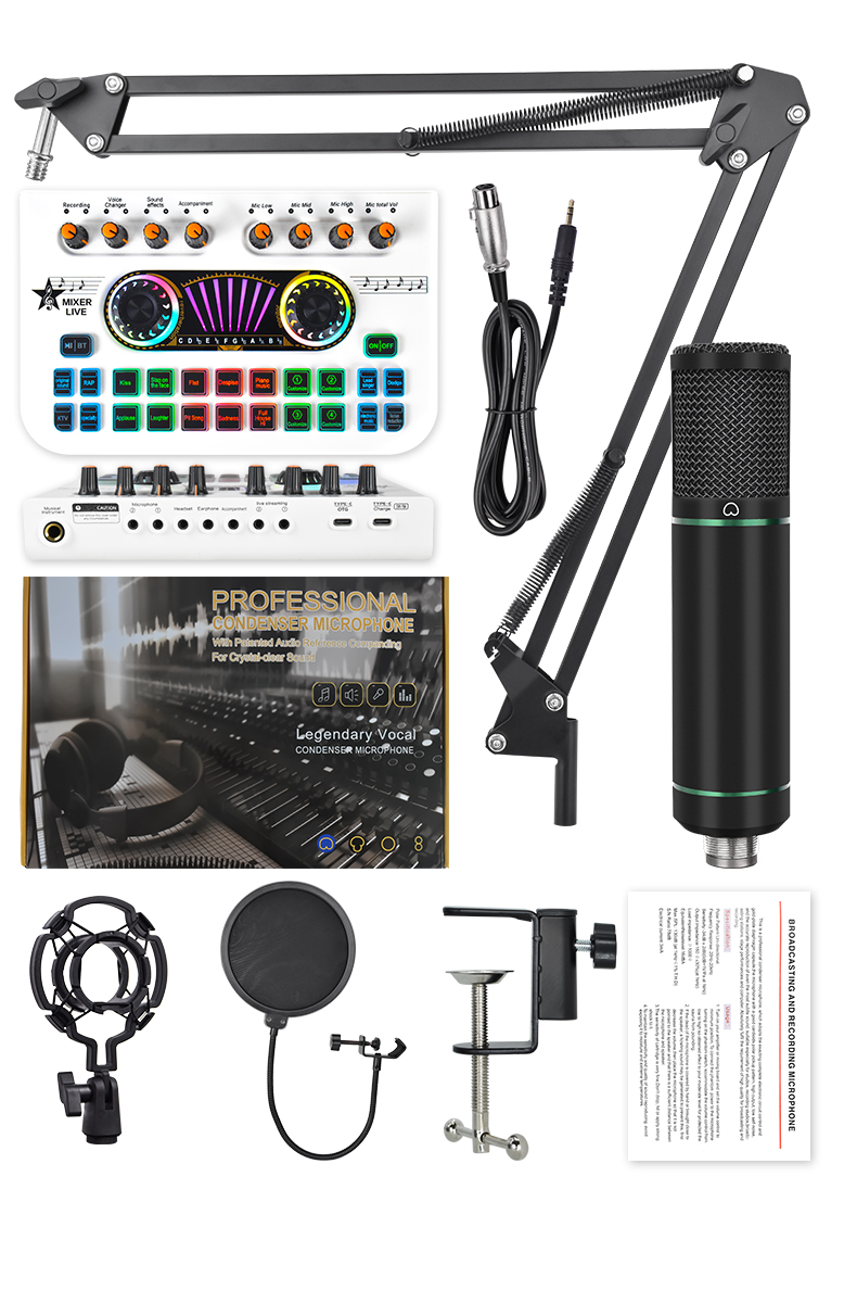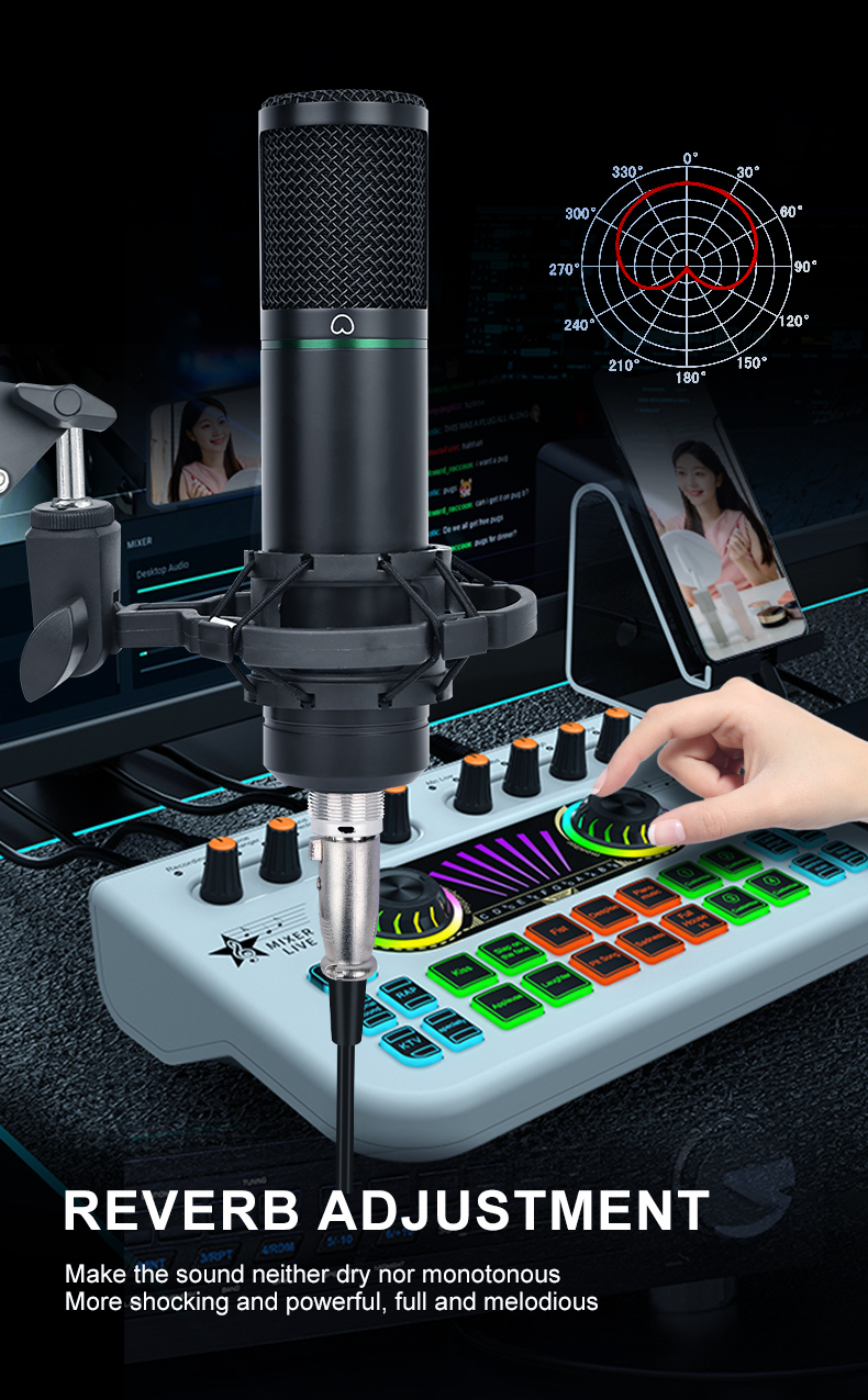 This newly designed podcast kit contains most common functions(reverberation, treble-bass, noise reduction, accompaniment, dodge, voice change), you can enjoy the personalized live broadcast atmosphere.