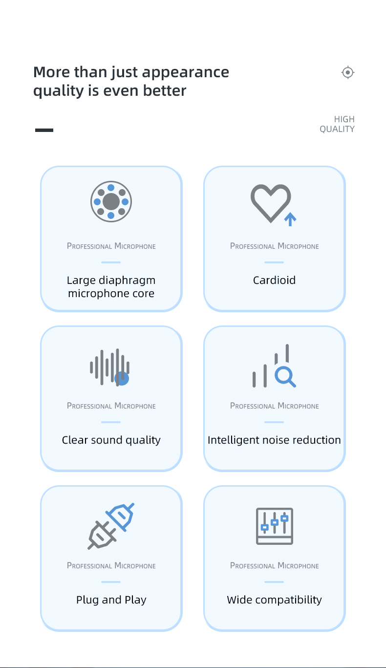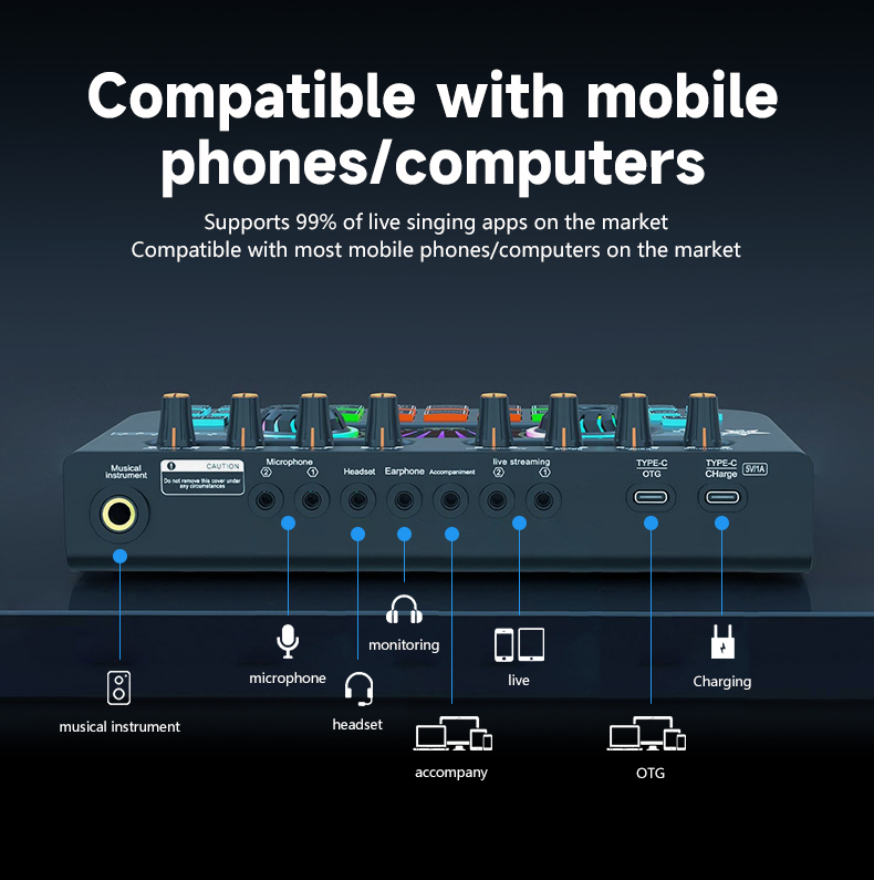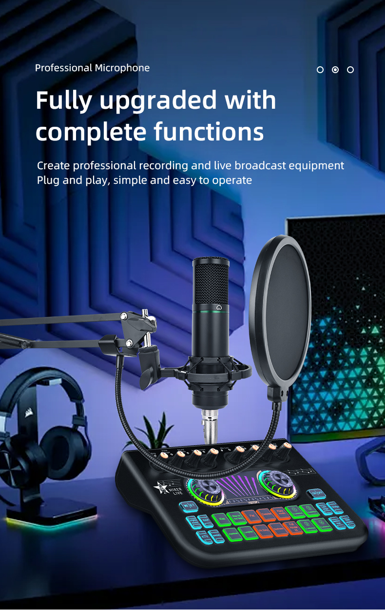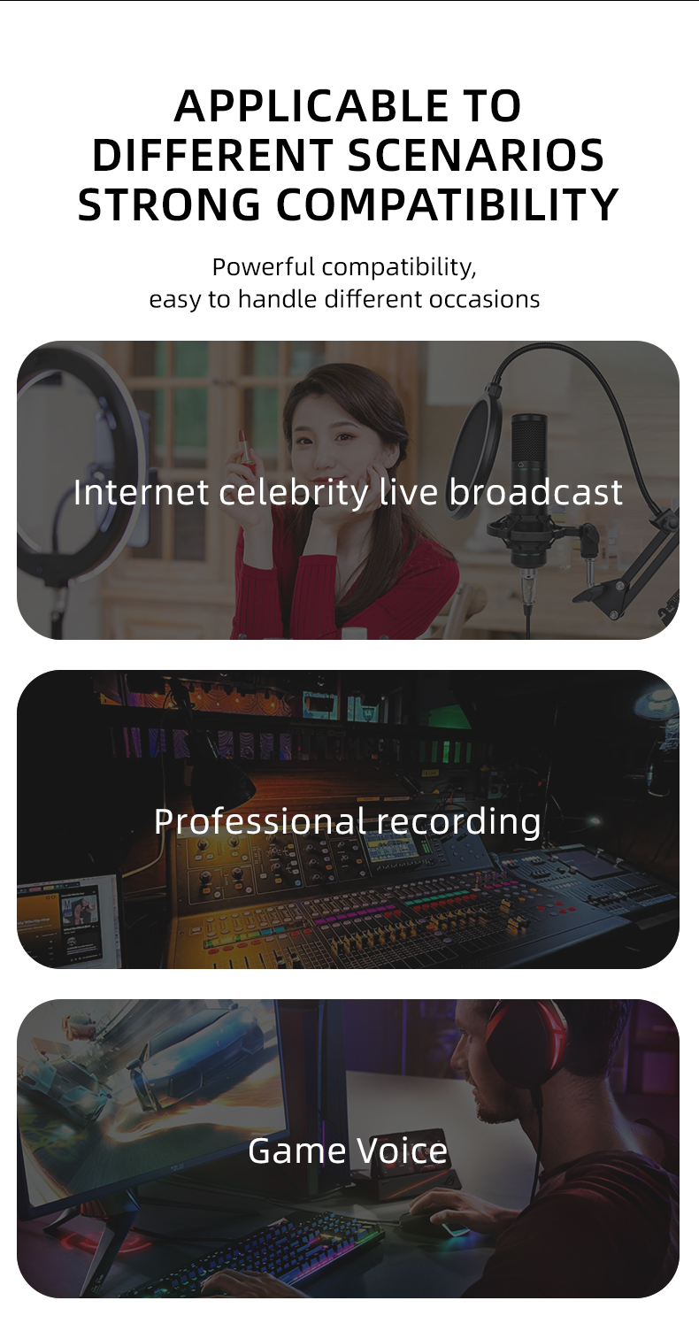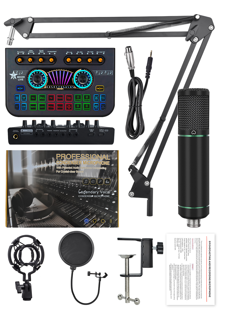 This newly designed podcast kit contains most common functions(reverberation, treble-bass, noise reduction, accompaniment, dodge, voice change), you can enjoy the personalized live broadcast atmosphere.
