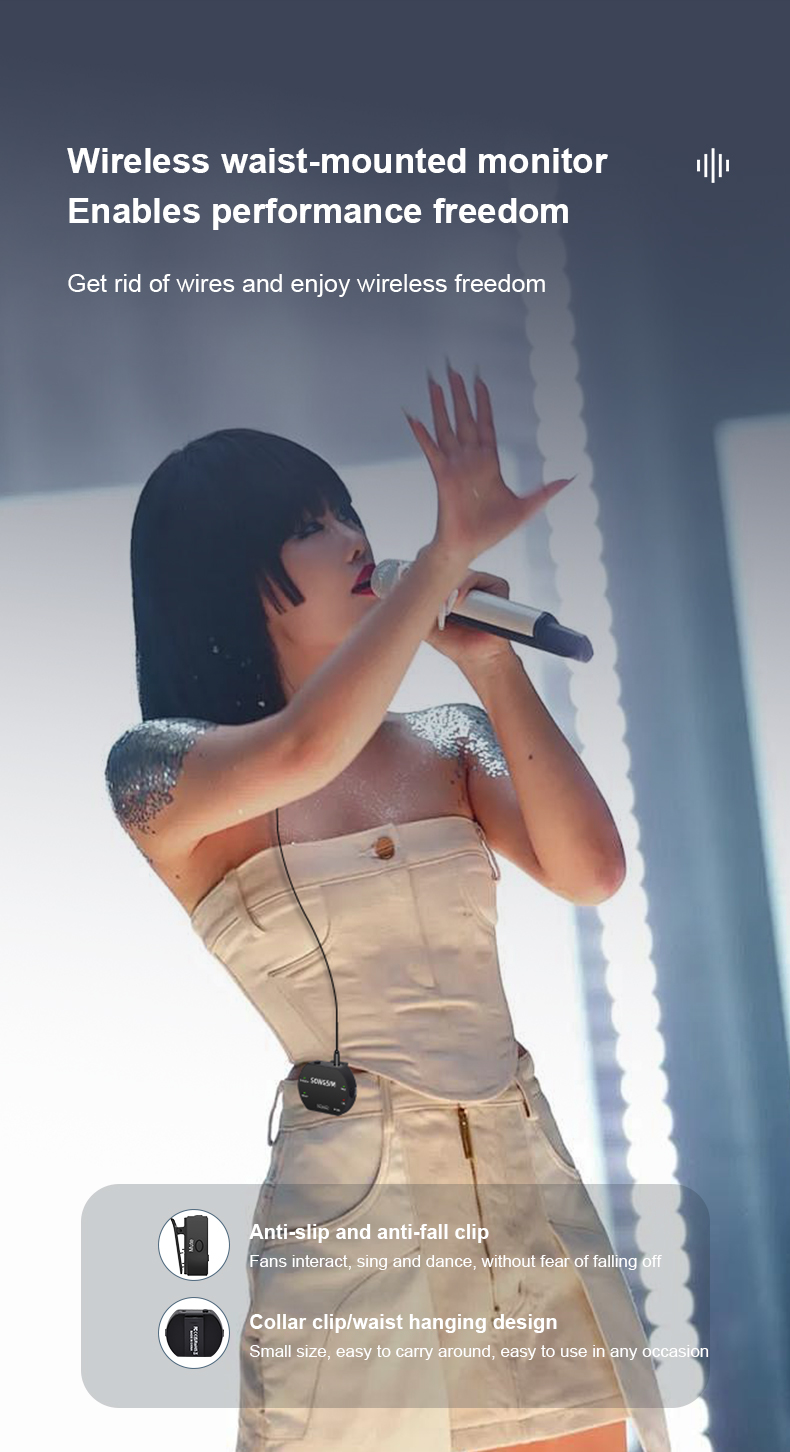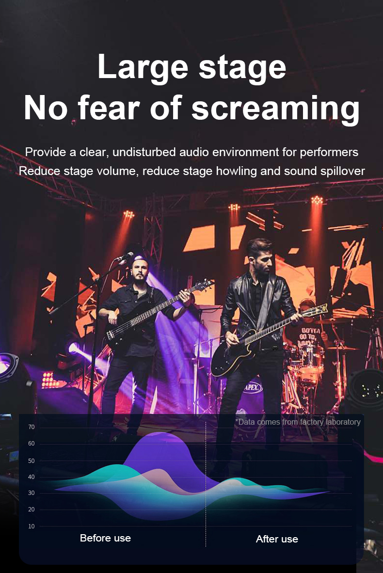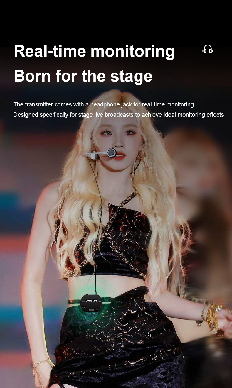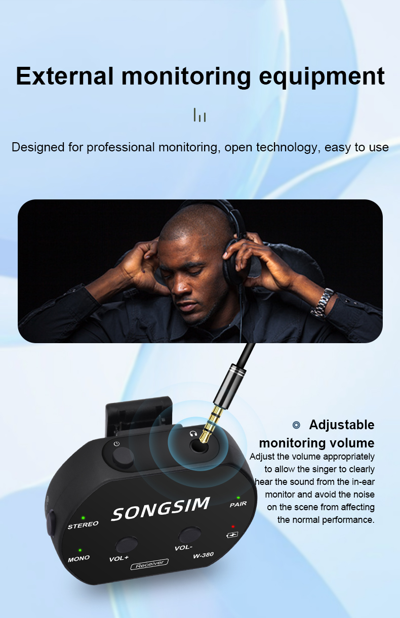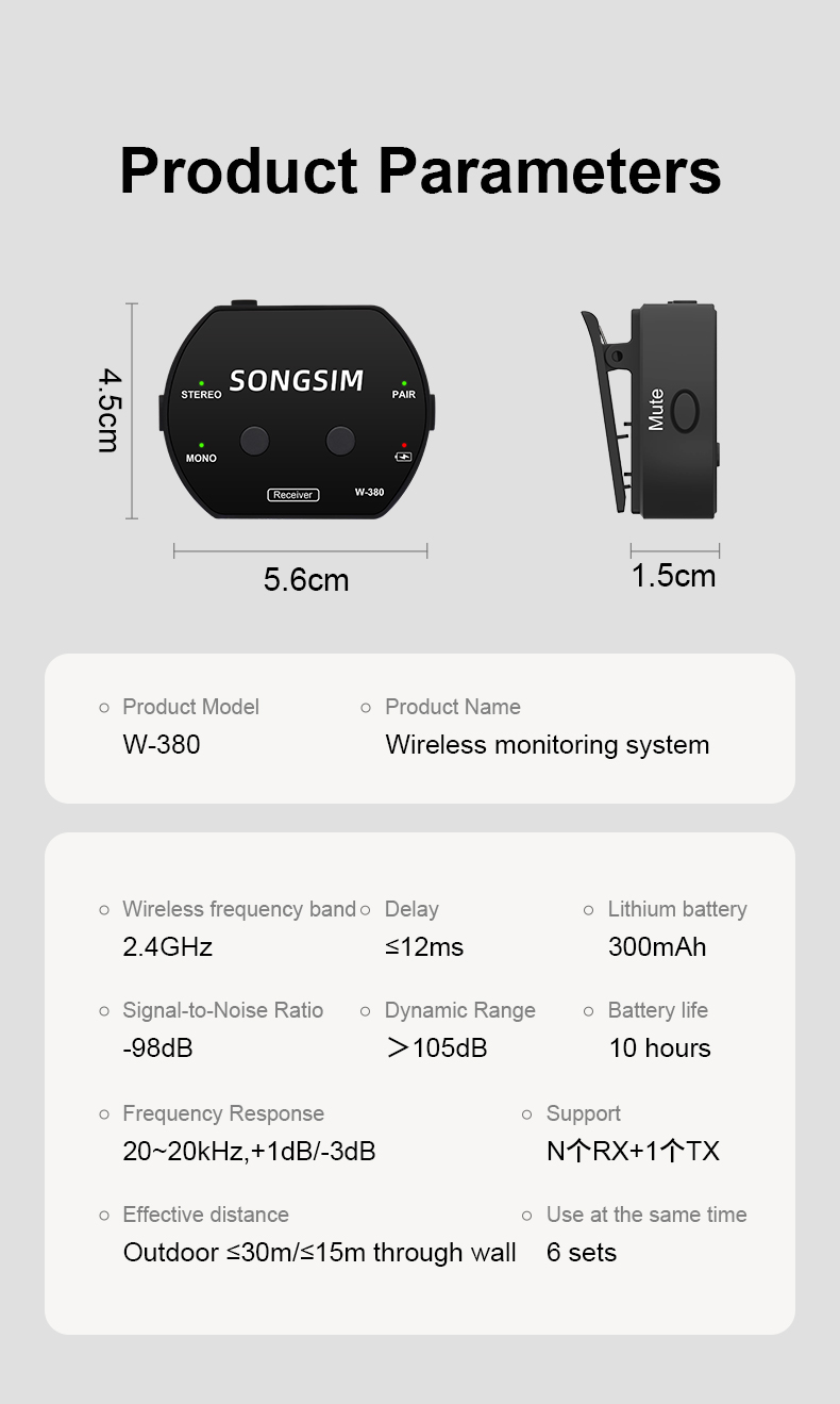 Ultra-low latency: the delay is less than 6 milliseconds, an efficient ear monitoring system, using 2.4G wireless technology, low latency, low noise, and decent sound quality. 24-bit/48K HD, 20-20K Hz frequency range, 105 dB SNR. There is no problem using cordless headphones within 100 feet. (Note: Headphones are not included.)