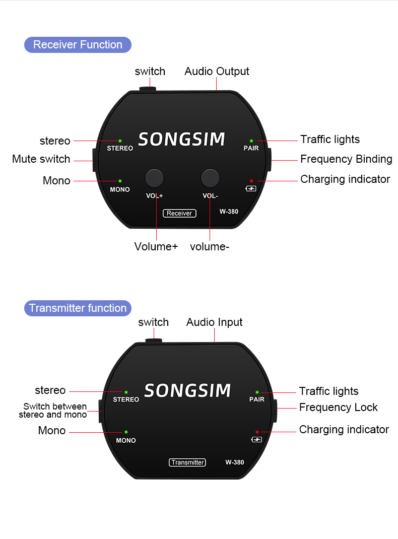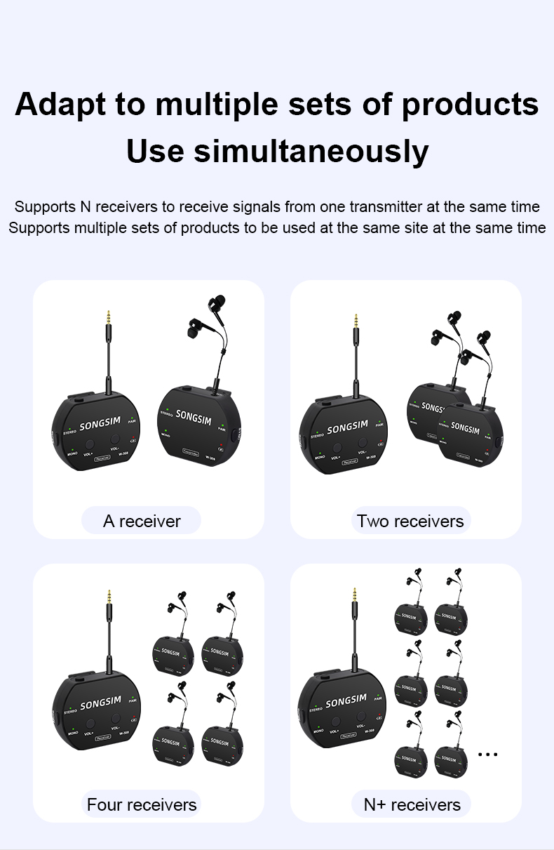 One-to-many: multiple receivers can be paired with one at the same time; turn on the receiver power and quickly press the receiver's power button 3 times to re-pair. If you are using multiple sets of devices at the same time, please turn off the pairing device, and then follow the above steps to pair. Support up to 6 groups of monitors to work at the same time. The wireless ear monitoring system is suitable for small and medium-sized stage performances and daily rehearsals.![]()