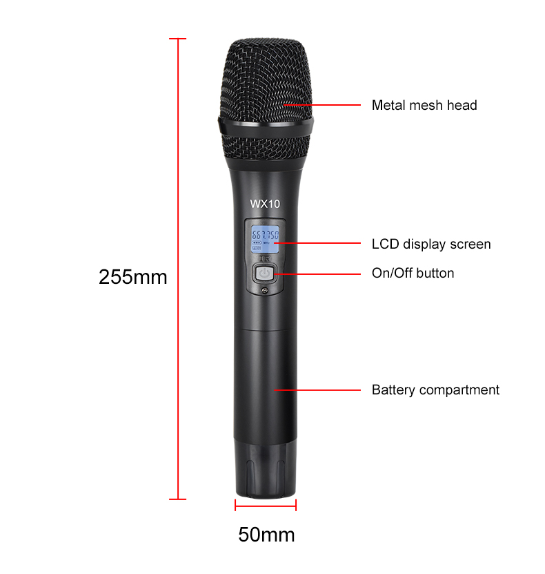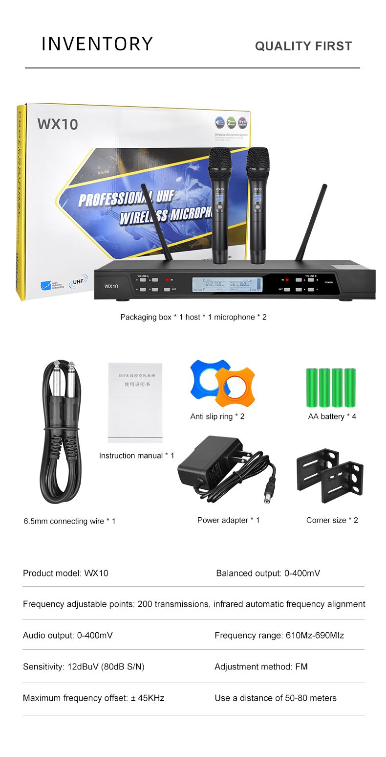 BOX CONTENTS: 1 x dual-channel wireless metal receiver, 2 x UHF handheld microphones, 2 x antennas, 1 x 1/4’’ audio cable, 1 x power adapter, 2 x anti-rolling rings, 4 x AA batteries for 16hrs long hour use, 1 x user manual