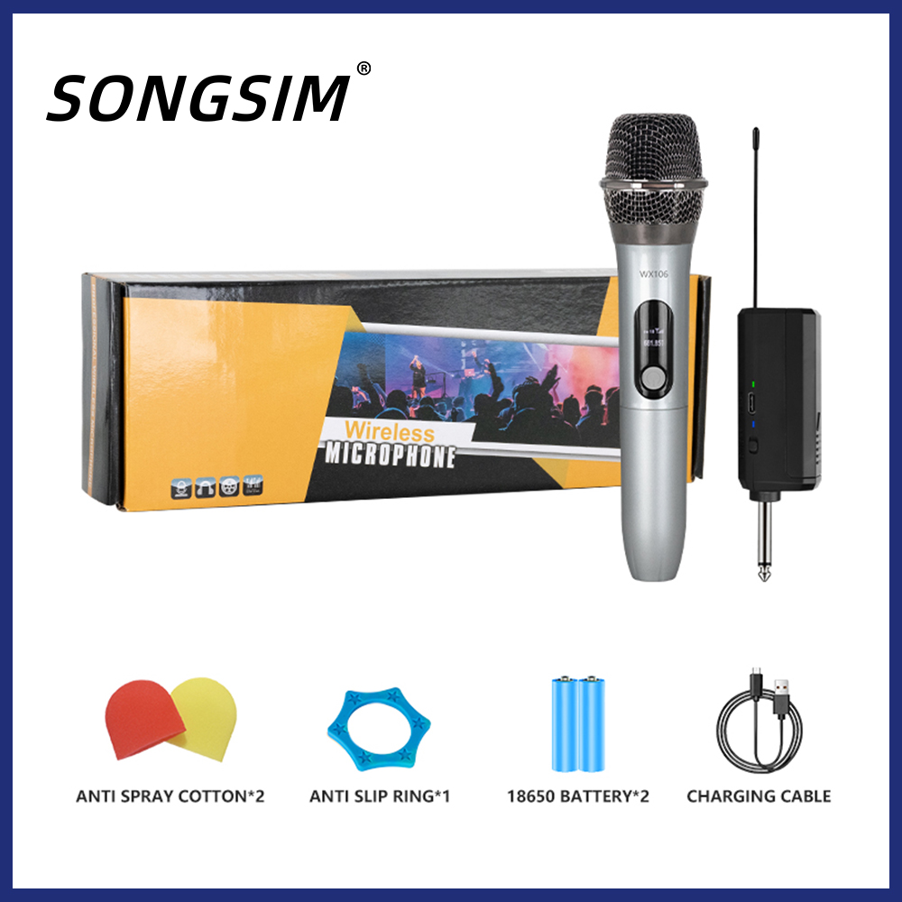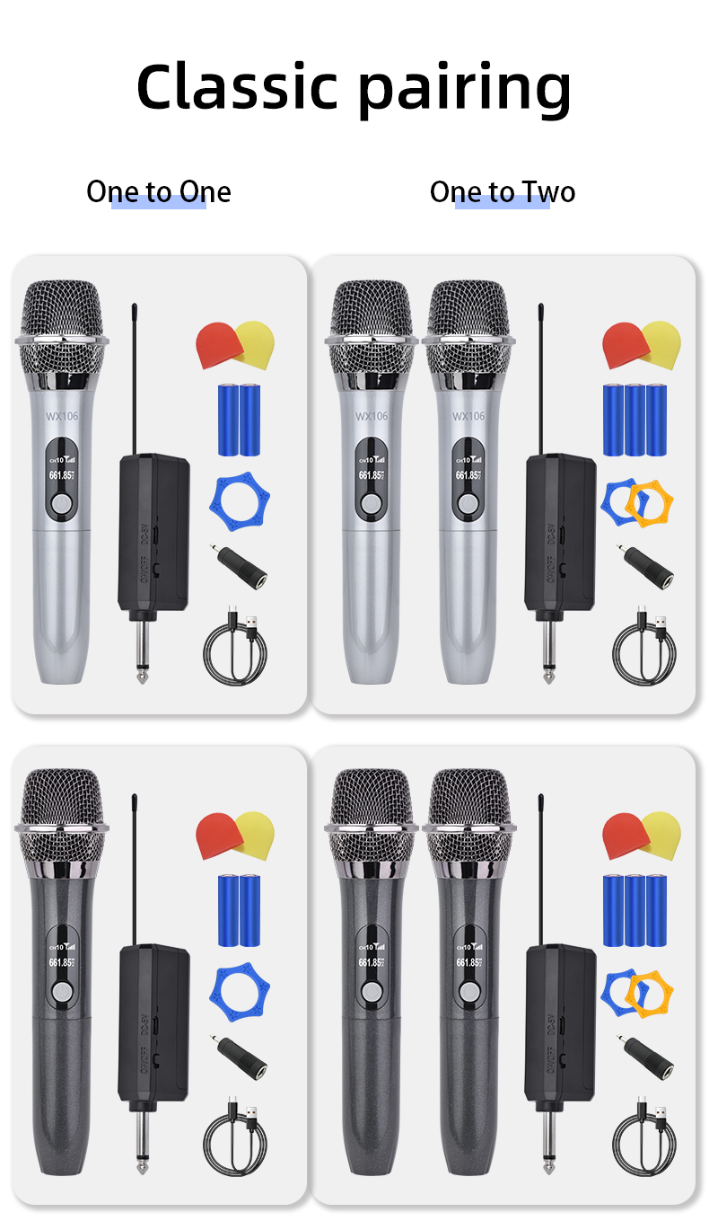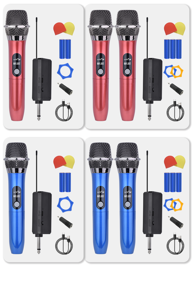 What You Get:2 x handheld microphone, 1 x receiver with a 6.35mm plug, 2 x anti-slip ring, 2 x mic cover, 1 x USB charging cable, 1 x manual.